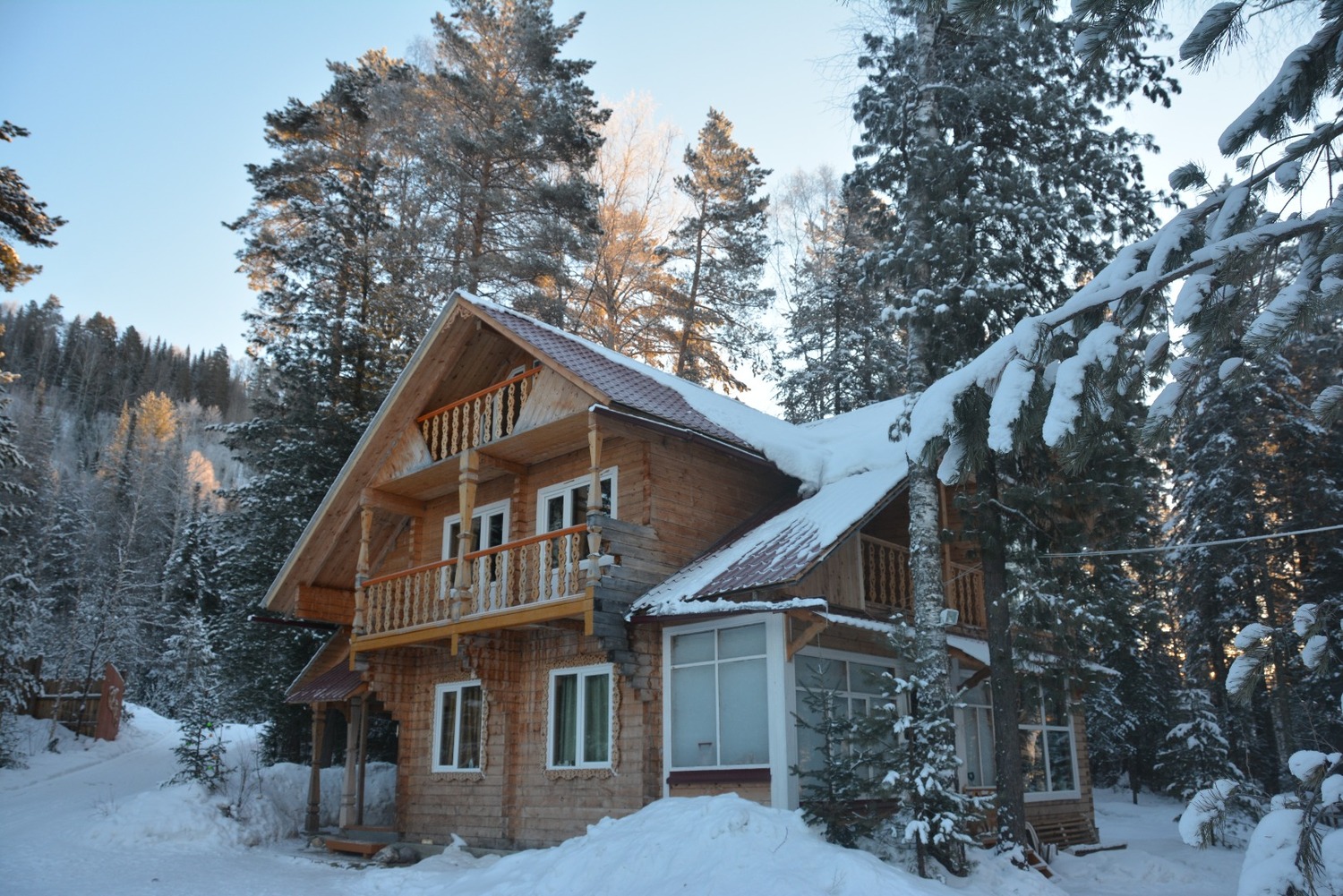• Территория комплекса занимает 2 гектара в окружении кедрового леса — здесь всегда тишина, свежий воздух и потрясающие виды на реку и горы.